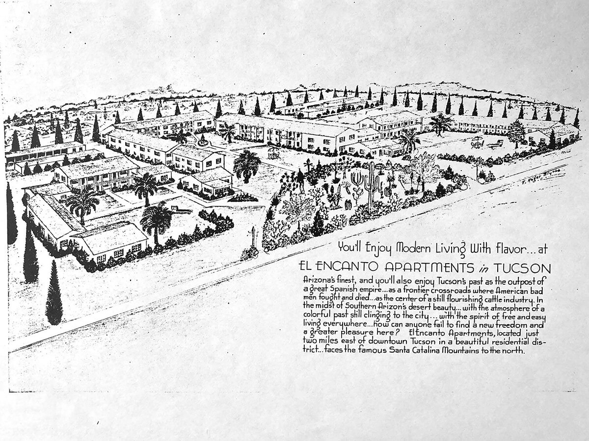 El Encanto Apartments located just two miles east of downtown Tucson in a beautiful residential district...faces the famous Santa Catalina Mountains to the north."