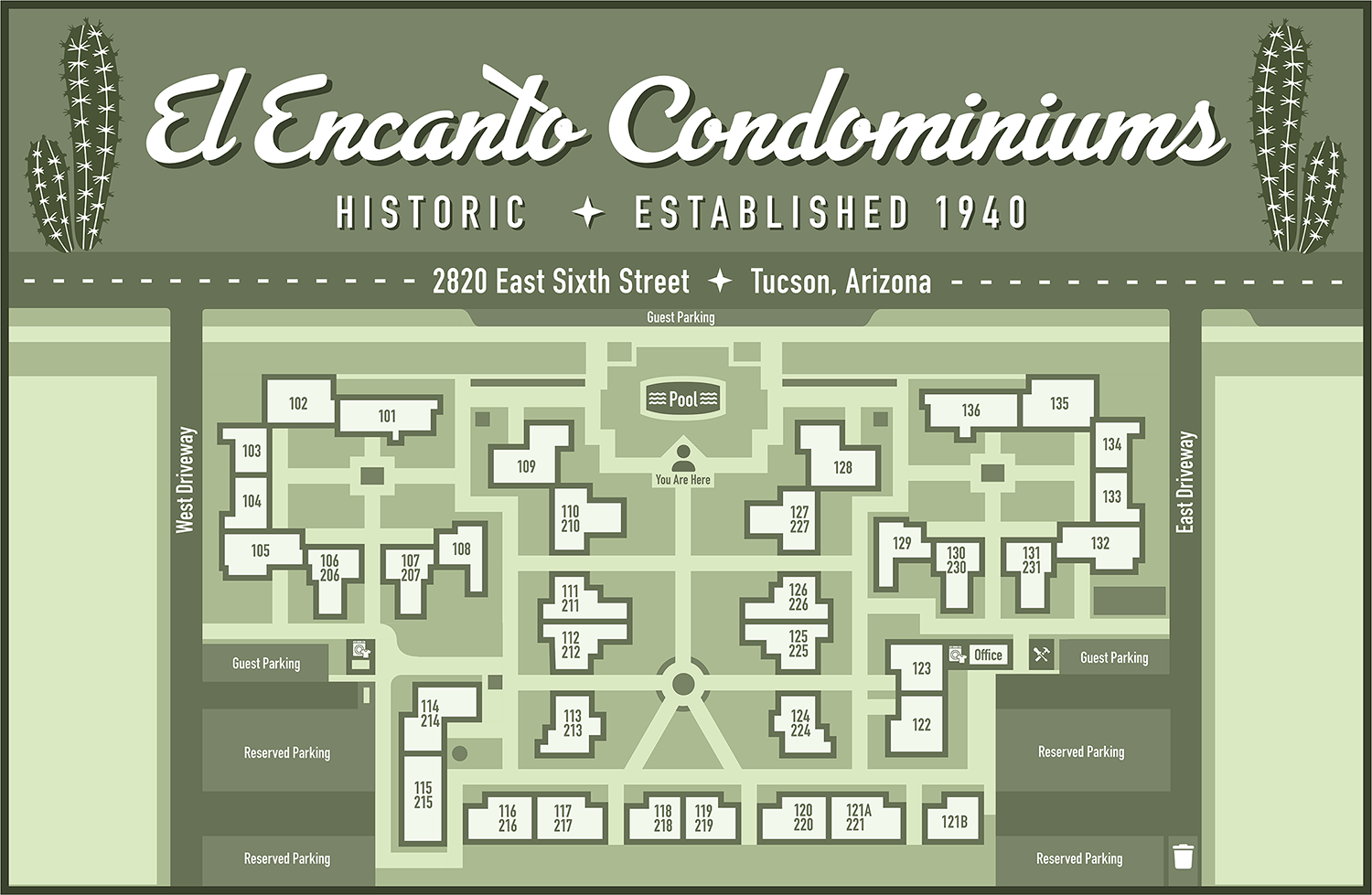 Built in 1940, historic El Encanto Condominiums is located in sunny Tucson, Arizona just a stones throw from the University of Arizona. Surrounded by the active and celebrated neighborhood of Sam Hughes, shopping, dining, parks, entertainment and education are all within walking distance. A heated pool, lush premises, and covered parking are just some of the amenities you can find here.